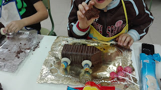 Nuestro erizo de pera y uvas y el fantástico tren de chocolate y chuches han sido las dos últimas recetas elaboradas maravillosamente por un grupo que se ha mostrado siempre super entregado y entusiasmado.